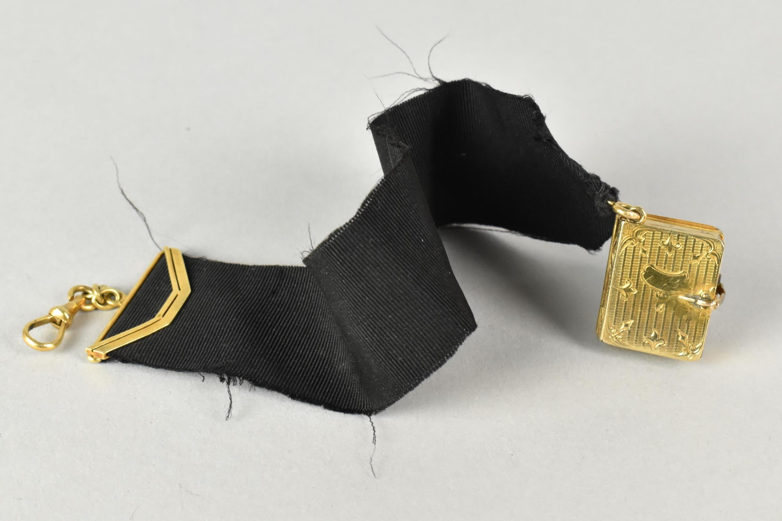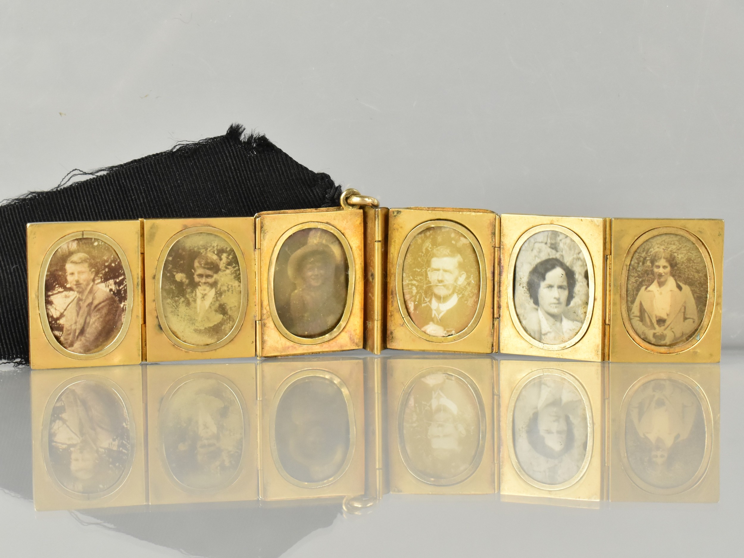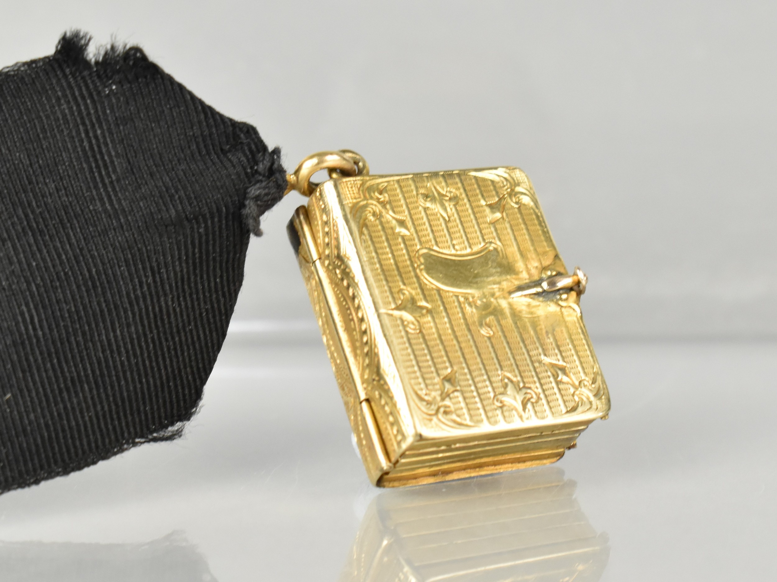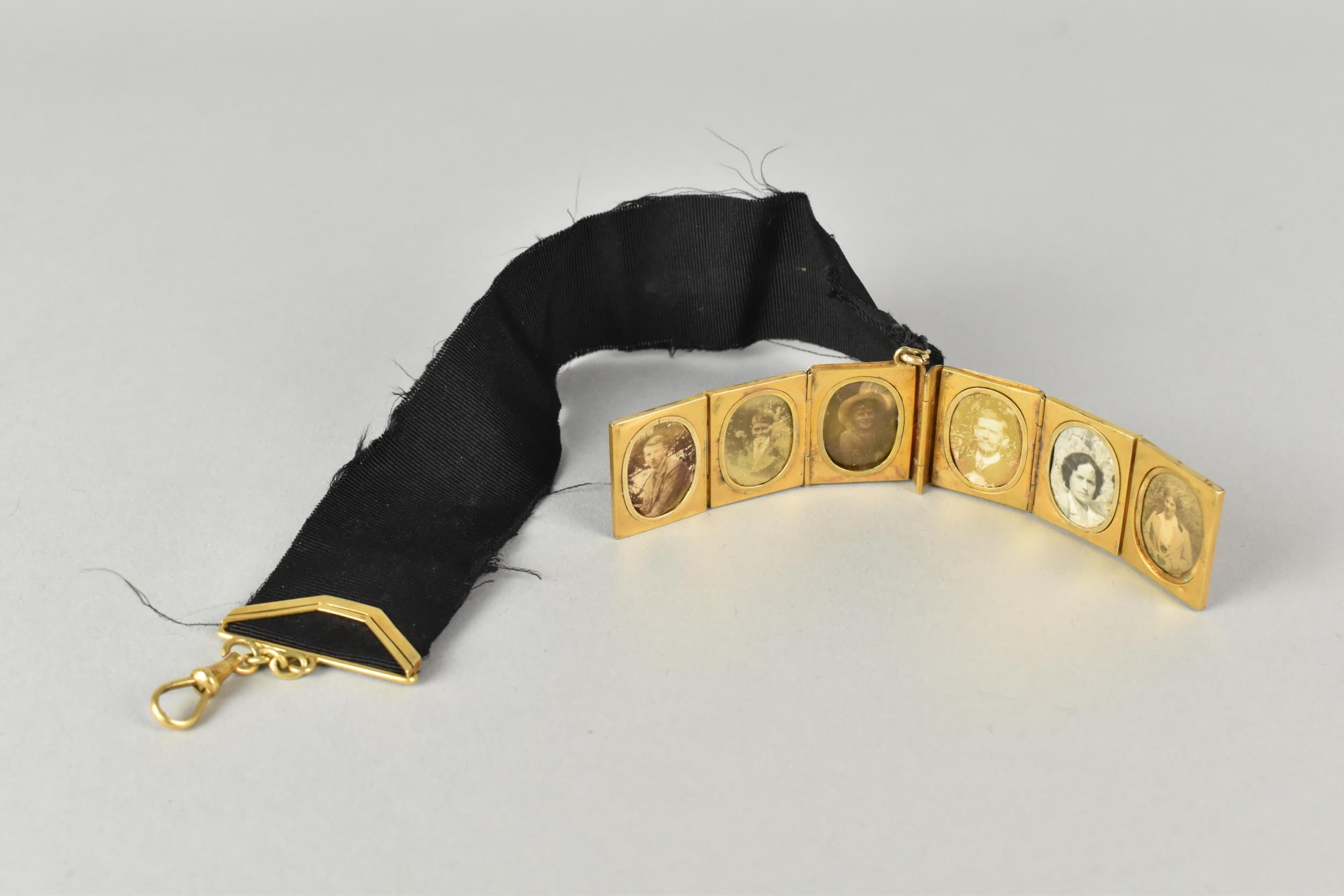 A Rare Victorian Six Panel Locket in the Form of a Folding Tooled Leather Bound Book Containing Various Family Portraits, Book in Unmarked Gold Coloured Metal but Having Black Ribbon Mounted with 18ct Gold Dog Clip Clasp, Ribbon Mount and a Bolt Ring Clasp Also Stamped 18ct, Locket 20mm by 9.2mm and 23.9mm Tall,