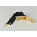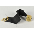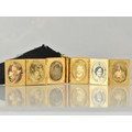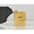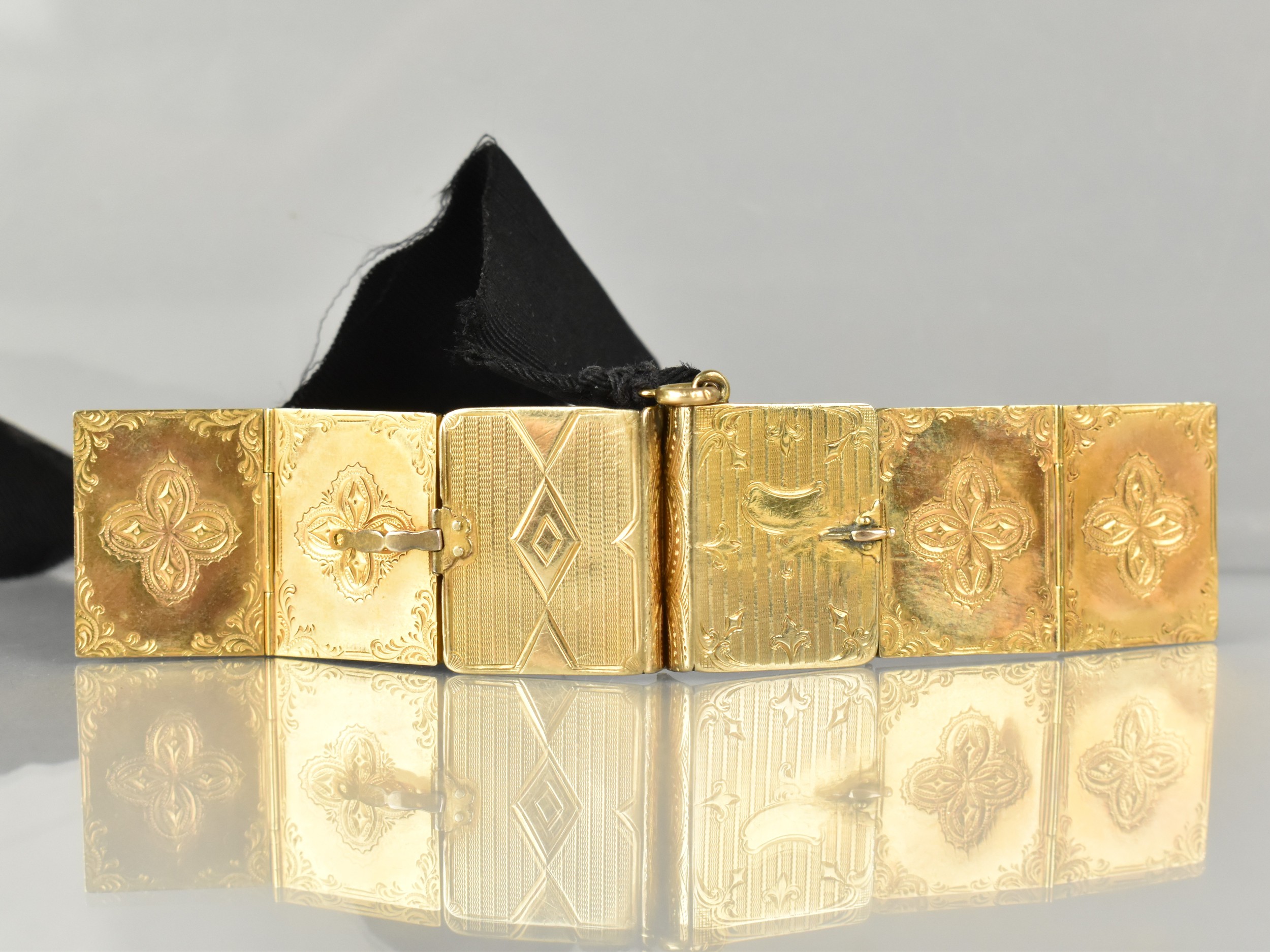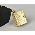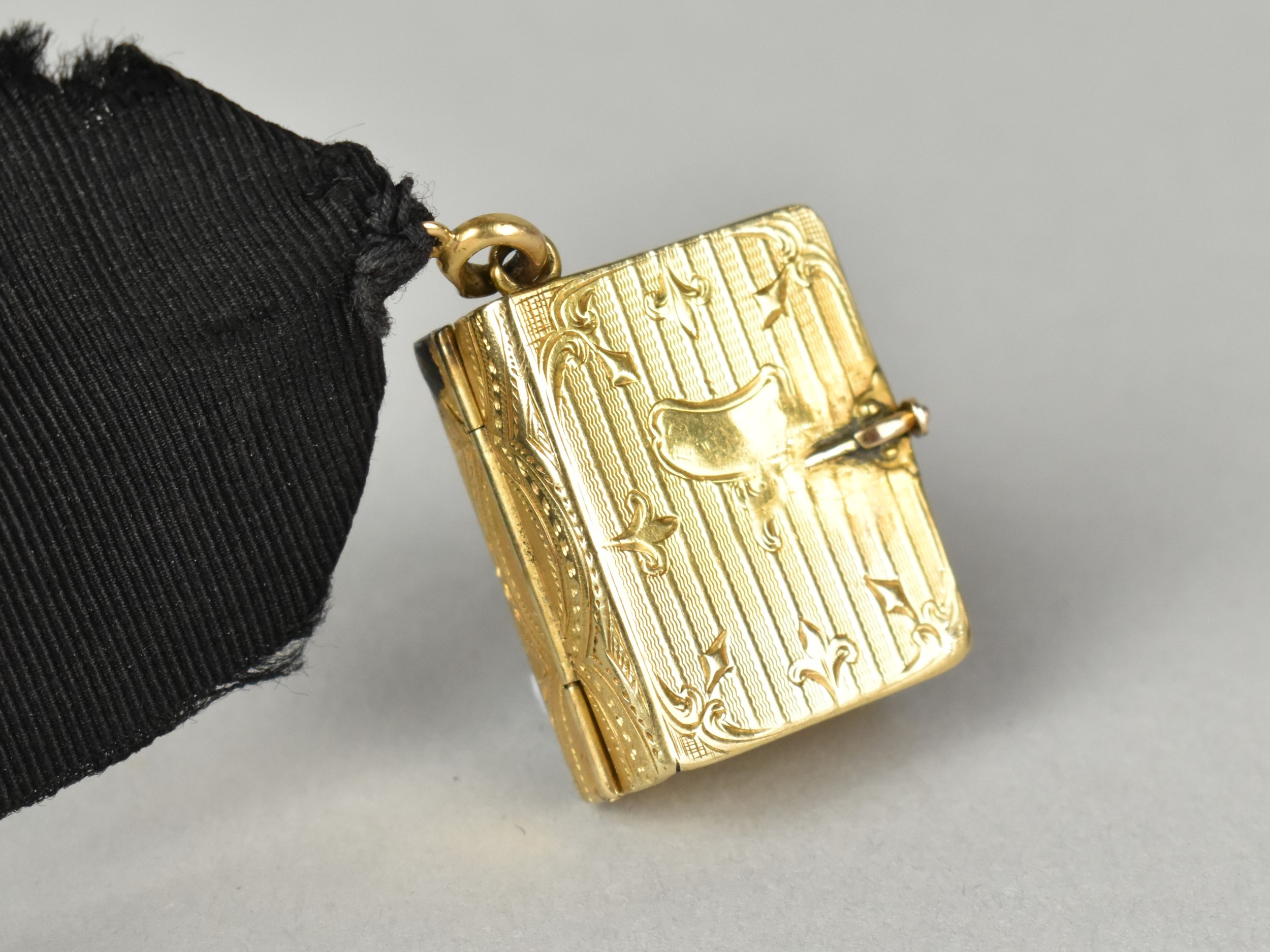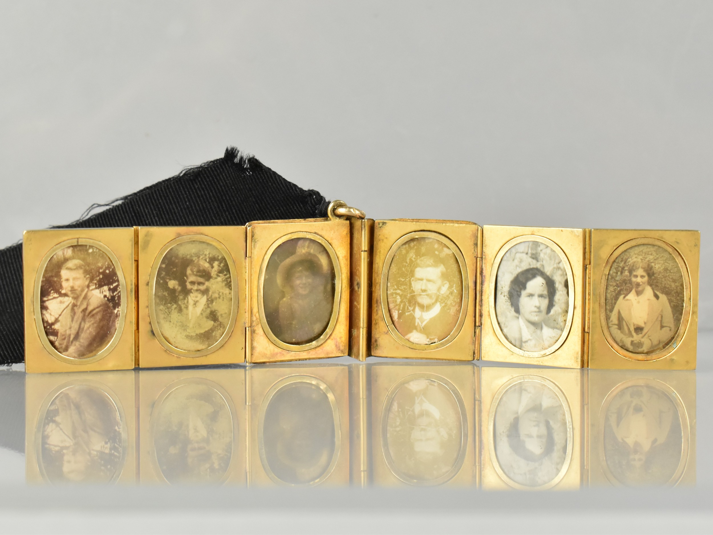A Rare Victorian Six Panel Locket in the Form of a Folding Tooled Leather Bound Book Containing Various Family Portraits, Book in Unmarked Gold Coloured Metal but Having Black Ribbon Mounted with 18ct Gold Dog Clip Clasp, Ribbon Mount and a Bolt Ring Clasp Also Stamped 18ct, Locket 20mm by 9.2mm and 23.9mm Tall,
