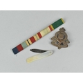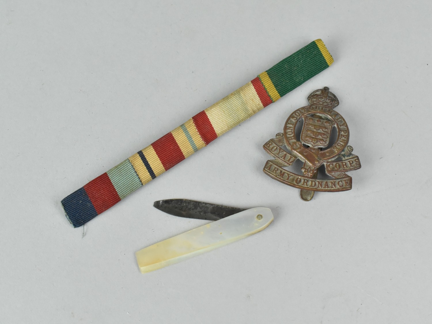 A Royal Army Ordnance Corps Cap Badge, a Small Fruit Knife with Mother of Pearl Scales and a WW2 Medal Ribbon Bar