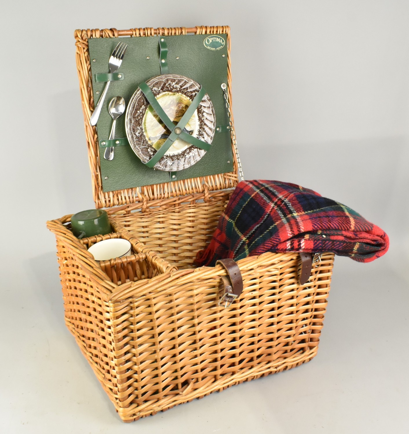 A Wicker Picnic Set by Optima with Blacket, Mugs, Plates Etc...