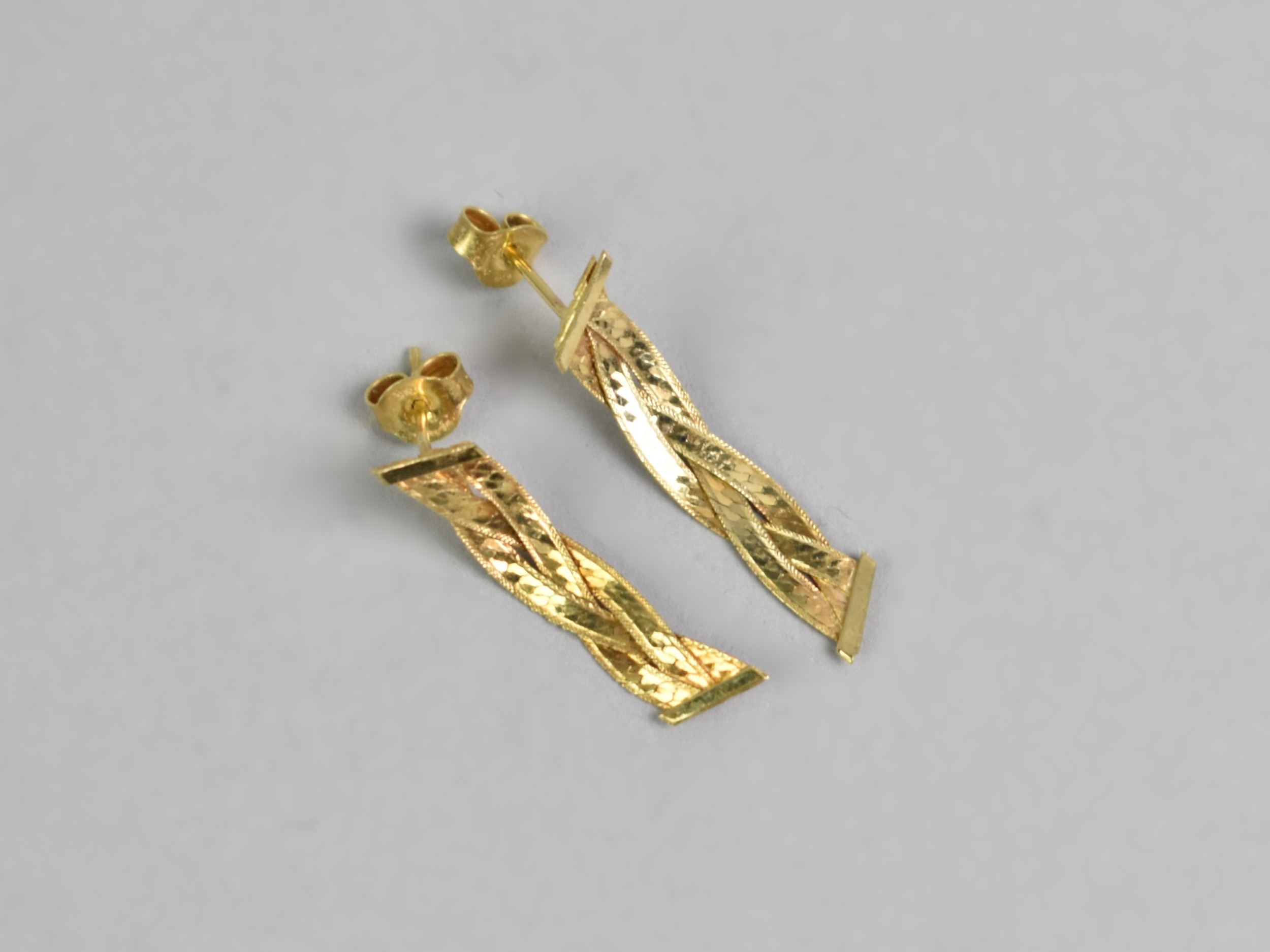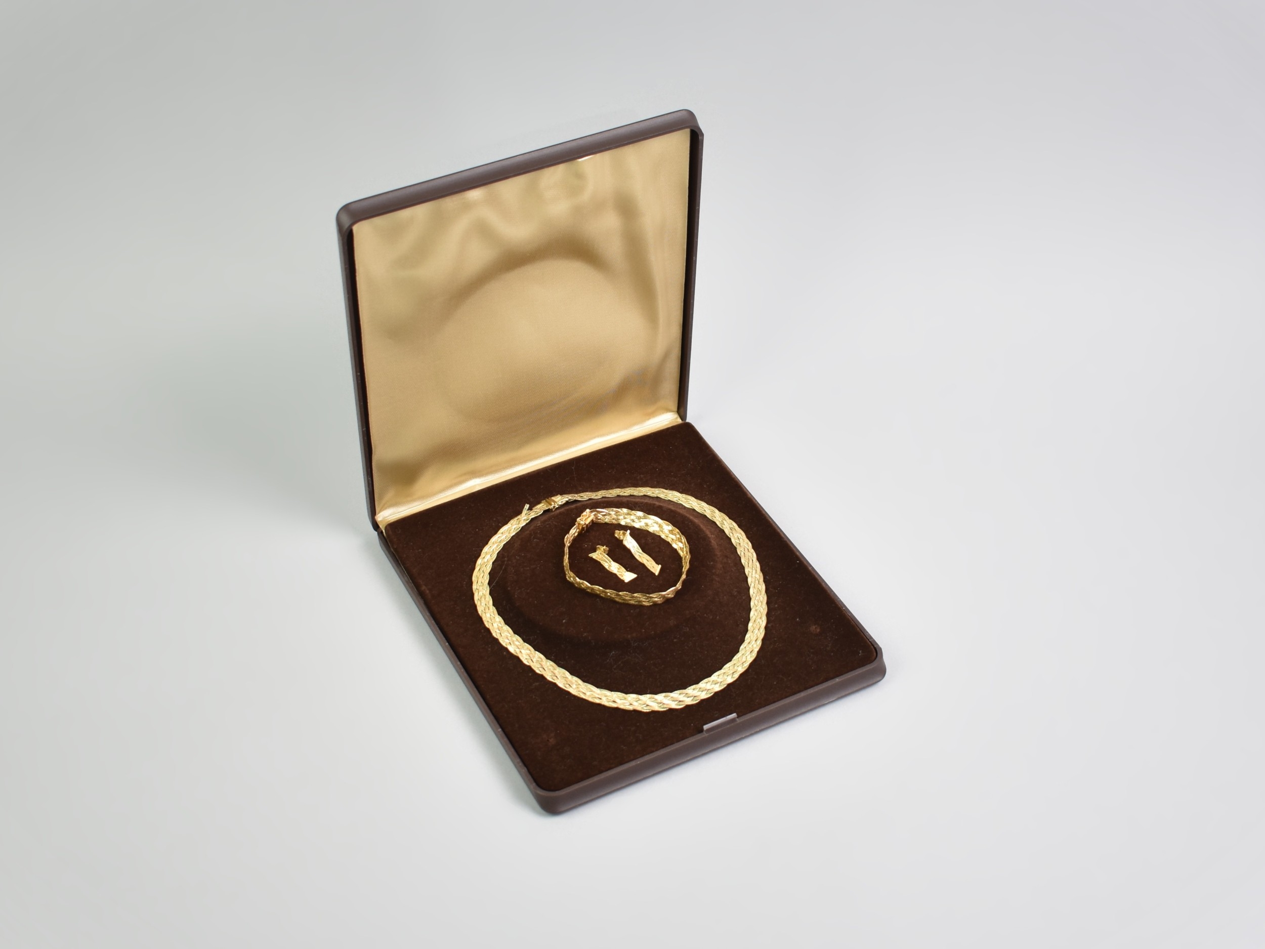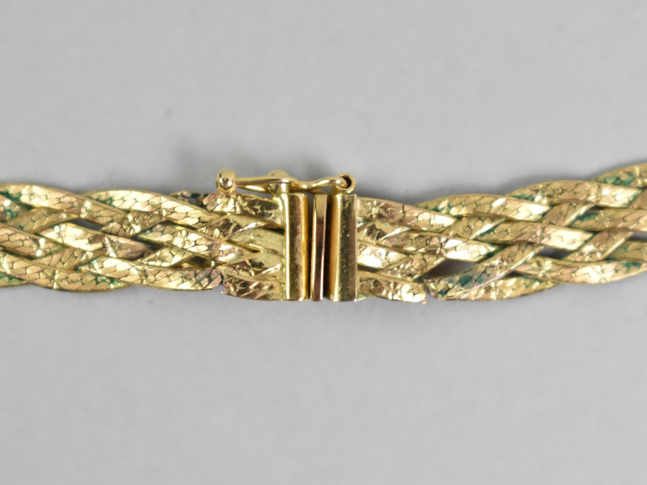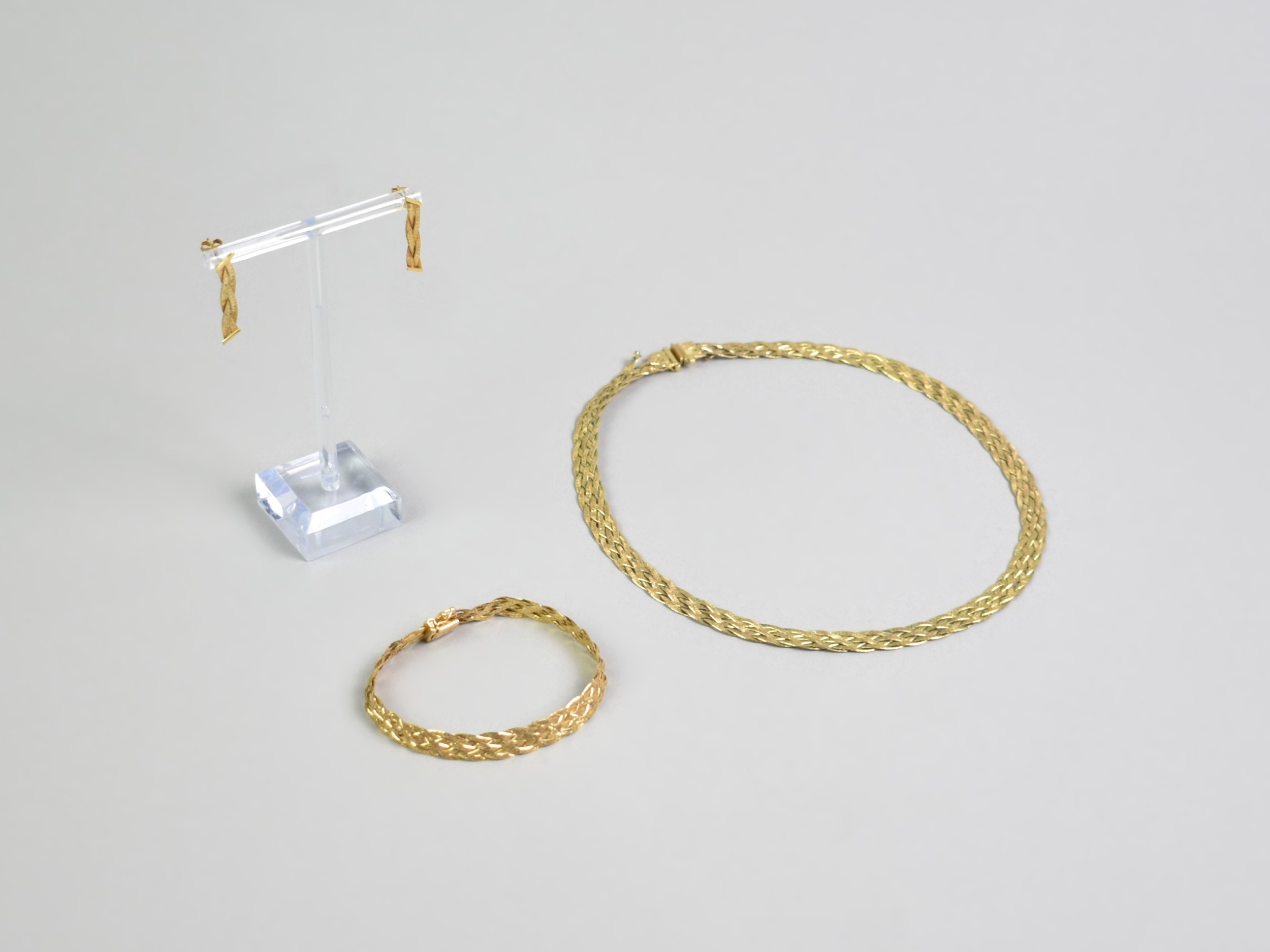 A Suite of Italian 9ct Gold Jewellery to Comprise Six Row Plaited Necklace and Bracelet, 20.2gms together with a Matched Pair of Earrings, 1.3gms, Both Necklace and Bracelet with Faults, Necklace 40cms Long and 7.7mm Wide, London Import Mark